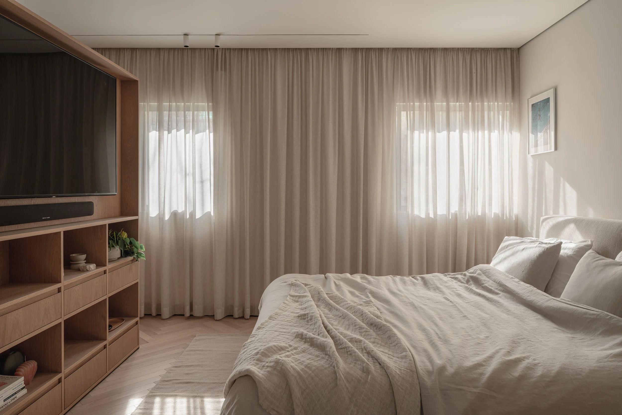 The unique property is positioned facing the breathtaking view of the Yarkon River, and we immediately understood that this vista must be the true star of the home. We chose a soft and bright color palette that allows the view outward to take center stage, creating an aesthetic that will stand the test of time.